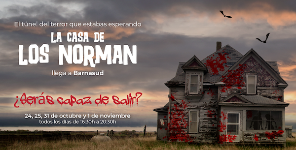 TÚNEL DEL TERROR – LA CASA DELS NORMAN. El Túnel del Terror és una experiència immersiva amb actors, escenografia i efectes especials. Aquest any, la temàtica és “La Casa dels Norman”, una misteriosa família amb secrets ocults que els visitants hauran de descobrir mentre travessen diferents sales plenes d’intriga i sorpreses. L’experiència oferirà dos nivells d’intensitat per adaptar-se a tots els públics: una versió per a adults i una versió familiar 100% adaptada, pensada perquè els més petits puguin gaudir sense passar por. Una combinació única d’entreteniment, ambientació i diversió per viure un Halloween inoblidable. Dies: 24 i 25 d’octubre, 31 d’octubre i 1 de novembre. Horari: de 16.30 h a 20.30 h. Lloc: Barnasud, C/ Progrés 69, 08850 Gavà (Barcelona). Edats: per a tots els públics, amb modalitat infantil i versió adulta més intensa. Preu: gratuït, amb accés mitjançant l’app de Barnasud. Més info: Halloween a Barnasud.