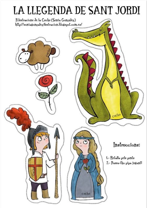 Si vols preparar i gaudir amb els teus nens d’aquest dia i contar la Llegenda en família, aquí et deixem un descargable fantàstic per als nens. Poden pintar-ho o simplement retallar-ho i junts contar la meravellosa llegenda de Sant Jordi. Podeu descarregar les imatges en color i en blanc i negre per a pintar.