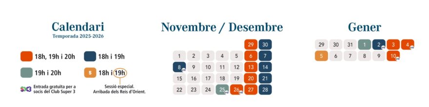 Sessions gratuïtes per als membres del Club Super3 (fins a 14 anys): 8, 25 i 26 de desembre de 2025 i 2, 4 i 10 de gener de 2026.